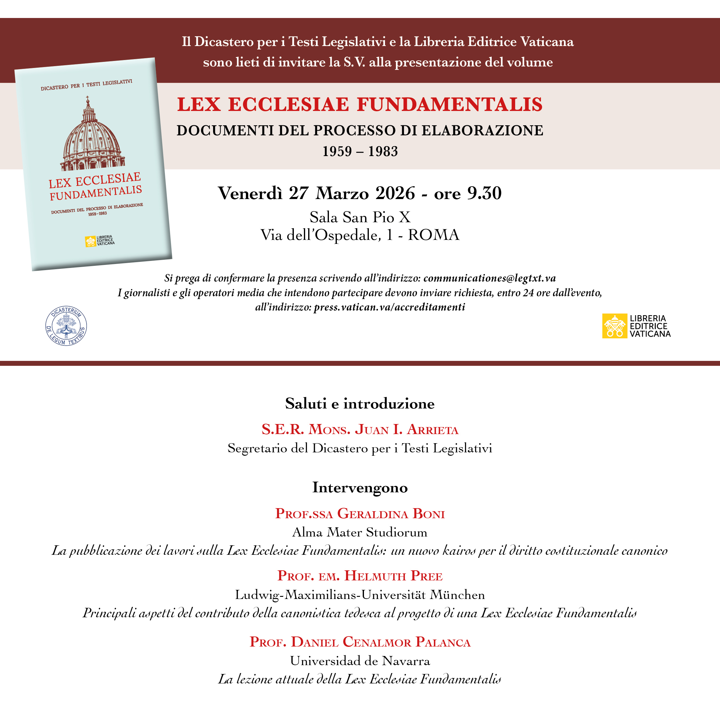 to invite you to the presentation of the volume LEX ECCLESIAE FUNDAMENTALIS. DOCUMENTS OF THE DRAFTING PROCESS 1959–1983