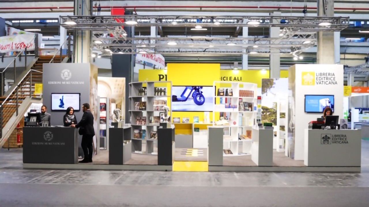 Come ogni anno l’Editrice porterà in esposizione tutte le sue ultime novità editoriali, le sue Collane e i testi magisteriali di Papa Francesco e dei suoi predecessori, tra cui Benedetto XVI e San Giovanni Paolo II. Il tema del 32° Salone, “Il gioco del mondo” – dal titolo del libro di Julio Cortázar, che auspica una cultura senza barriere né linee divisorie, capace di saltare i confini e frantumare muri – è presente nella pavimentazione dello stand attraverso un inserto che si ispira al “gioco della campana”. Realizzato in tre colori, bianco, grigio e giallo, questo inserto ricorda uno dei giochi più diffusi dell’immaginario collettivo, in cui dal riquadro di partenza, disegnato con un gessetto (“terra”), avvengono i lanci del sassolino dove saltare su un solo piede, fino all'ultima casella chiamata “cielo”. Tra “Terra e Cielo” la visione dell’editoria vaticana si esprime attraverso la forza della Parola e della spiritualità dell’arte per fare da ponte tra i diversi saperi. Per questo motivo l’allestimento dello stand è stato articolato come una spazialità aperta e permeabile allo scambio delle idee, espressa attraverso delle pareti e librerie curve e grazie ad una spazialità dinamica, capace di favorire l’accoglienza. In occasione dell’appuntamento è stata lanciata attraverso Vatican News una campagna informativa#SociaLEV che illustra il ciclo produttivo dell’Editrice: è composta da cinque brevi video clip che ruotano attorno al viaggio di un monopattino elettrico alla scoperta dei luoghi chiave all’interno e all’esterno del territorio vaticano.